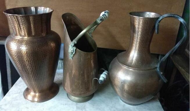 Wazon + węglarka + dzban Stare mosiężne/miedziane przedmioty (wazon, węglarka, dzban). Dekoracja praktyczna i stylowa ...